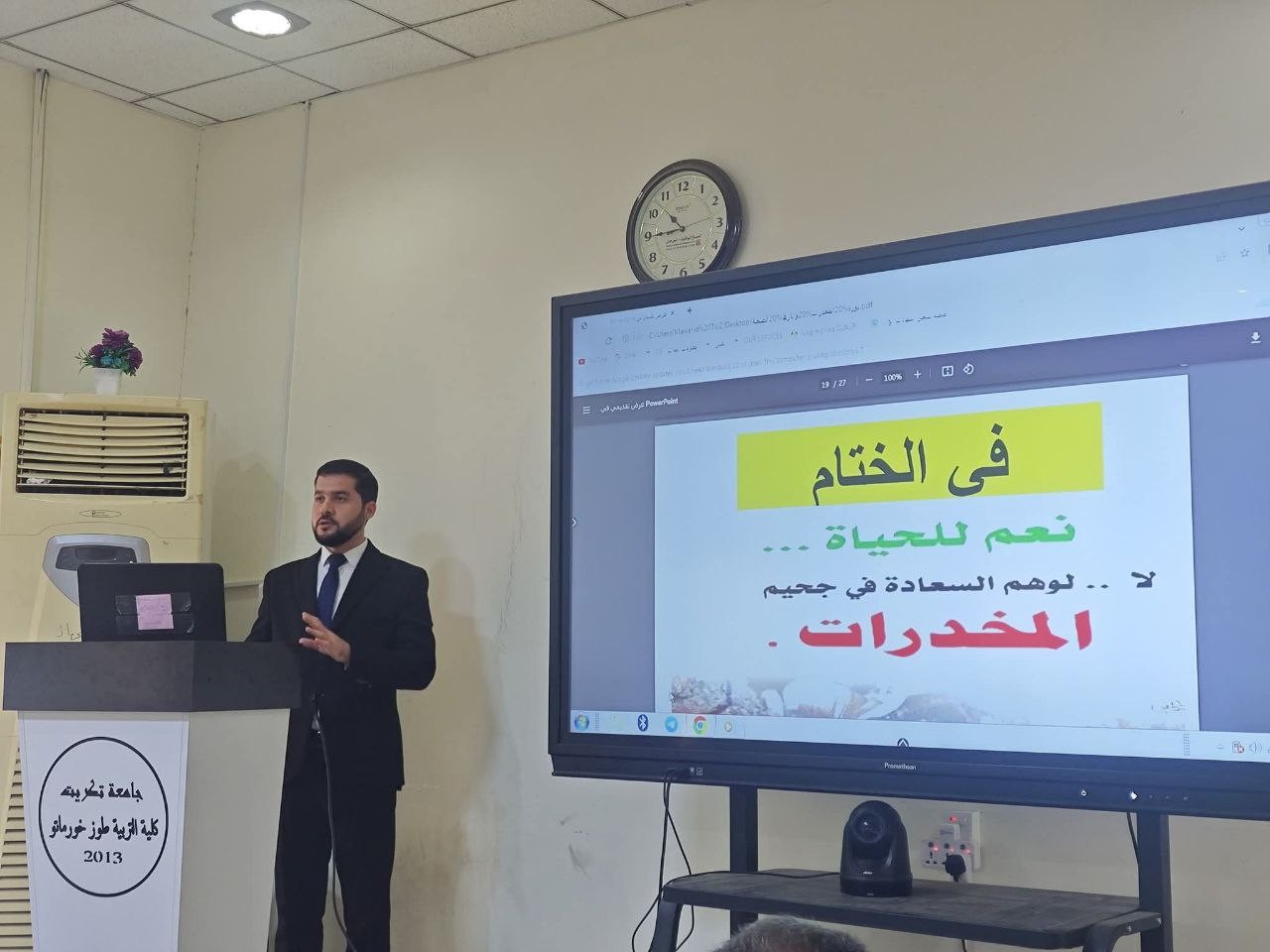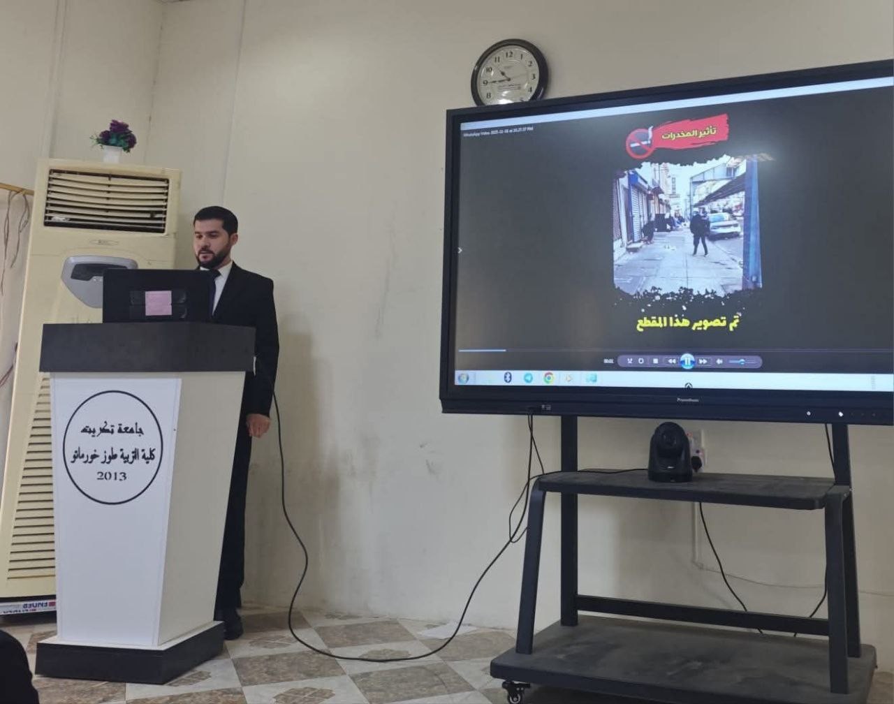 برعاية السيد رئيس جامعة تكريت الأستاذ الدكتور وعد محمود رؤوف وإشراف السيد عميد كلية التربية طوز خورماتو الأستاذ الدكتور نهاد علي شفيق والأستاذ المساعد الدكتور سياف عبد حسين مدير مركز التعليم المستمر أقامت كلية التربية طوز خورماتو ندوة توعوية بتاريخ الاثنين الموافق 17 / 11 / 2025 في تمام الساعة العاشرة صباحًا على قاعة شهداء طوز خورماتو بعنوان المخدرات أنواعها وآثارها الصحية وجاءت هذه الفعالية ضمن سلسلة النشاطات التي تهدف إلى تعزيز الوعي الصحي والوقائي تماشياً مع توجيهات وزارة التعليم العالي ورئاسة الجامعة. قدم الندوة كل من المدرس المساعد سجاد عبدالله الميتي علي والمدرس المساعد حيدر مهدي احمد والمدرس المساعد ريبوار كامل حسين حيث تناولت محاور الندوة بشكل موجز ومهني تصنيف الأنواع المختلفة للمخدرات وتوضيح الآثار الصحية الفورية والآثار طويلة المدى المترتبة على تعاطيها على أجهزة الجسم المختلفة بهدف تزويد الطلبة بالمعرفة اللازمة لحماية أنفسهم من هذه الآفة الخطيرة وبناء جدار وقائي فعال. #شعبة_الاعلام_والاتصال_الحكومي كلية التربية طوزخورماتو - جامعة تكريت