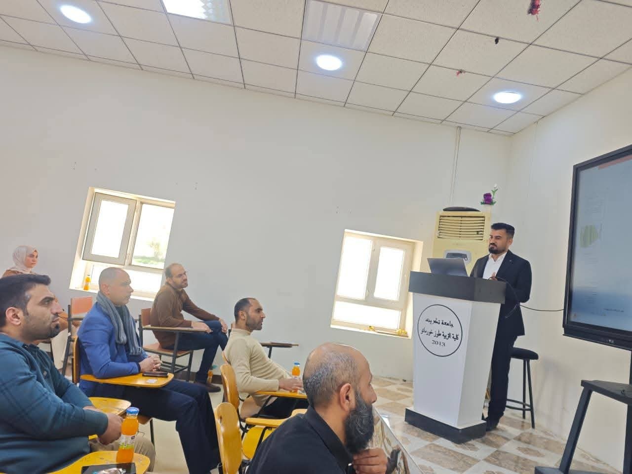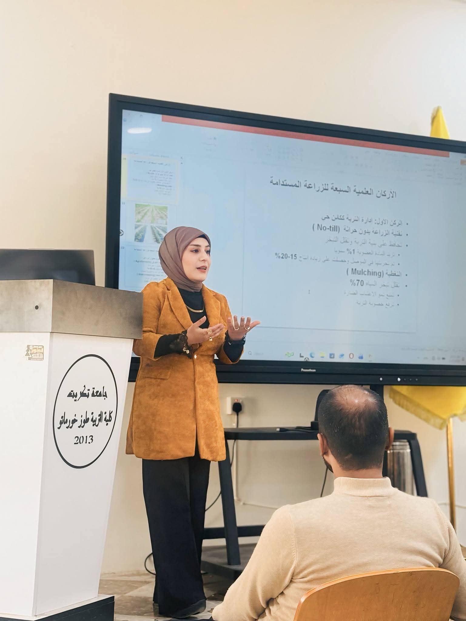 برعاية السيد رئيس جامعة تكريت الأستاذ الدكتور وعد محمود رؤوف، وبإشراف مباشر من الأستاذ الدكتور نهاد علي شفيق عميد الكلية، والأستاذ المساعد الدكتور سياف عبد حسين مدير مركز التعليم المستمر، أقامت كلية التربية طوزخورماتو بالتعاون مع مركز التعليم المستمر،وبجهود الدكتورة زينب جلبي محمد مسؤولة وحدة التعليم المسستمر في الكلية دورة علمية بعنوان (الزراعة المستدامة ودورها في تحقيق الأمن الغذائي) للفترة من 17 ولغاية 19 شباط 2026 وعلى قاعة شهداء طوزخورماتو، حيث حاضر فيها كل من (م.د سمار نشأت علي، م.د مهدي فاضل بهجت، م.م محمد حسين عزيز)، وقد ركزت الدورة في محاورها على التحديات الخطيرة التي تواجه الأمن الغذائي على المستويين العالمي والعربي، مع تسليط الضوء على معاناة العراق من مشكلة تملح التربة التي طالت ما يقارب 39% من أراضيه، مما اضطر البلاد لاستيراد نحو 70% من احتياجاتها الغذائية، كما استعرضت الدورة "الزراعة المستدامة" كحل عملي وستراتيجي لهذه الأزمات، مقدمةً مقترحاً لخطة وطنية طموحة تهدف لرفع كفاءة الري إلى 75% واستصلاح 2 مليون هكتار من الأراضي الزراعية لضمان مستقبل غذائي آمن.